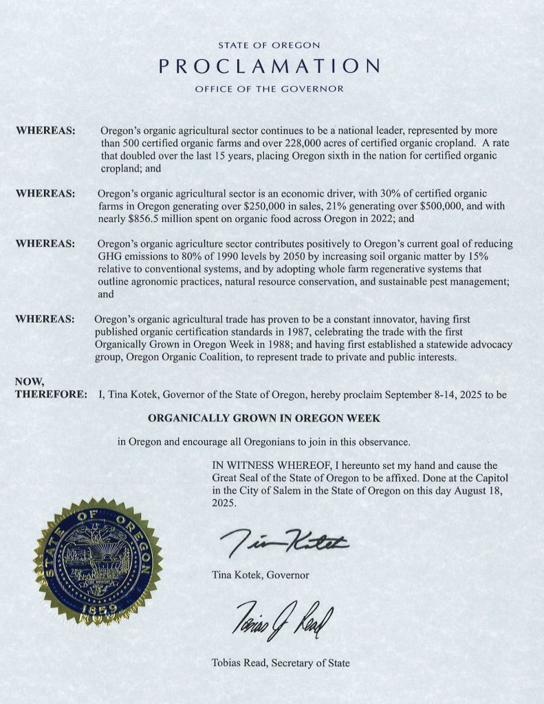 We’re thrilled to share that Governor Kotek has officially proclaimed September 8–14, 2025 as Organically Grown in Oregon Week!
